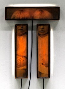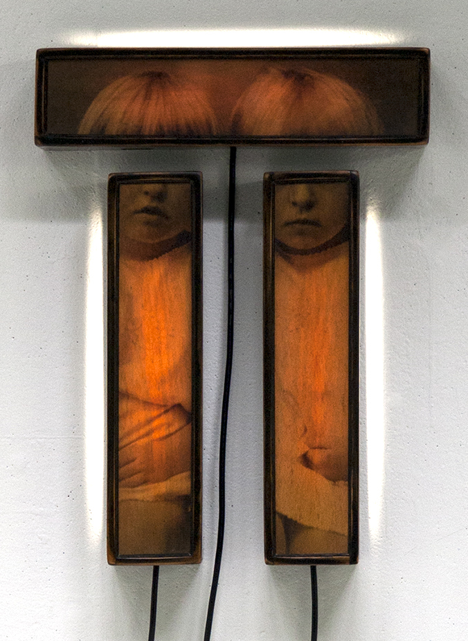 2013_inkjet print on veneered hoop pine, shellac, InkAid clear matte and iridescent silver precoat, polycarbonate, wood, florescent lights_set of three_40 x 9.5 x 9.5cm each