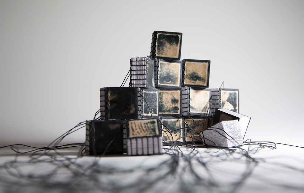 f_Ø_133 (detail-books) August 30, 2014September 1, 2014 / kurtis adamson 2013_inkjet print on Fabriano, Parchment paper, shellac, waxed linen thread_3.1 x 3.1cm, 136pg per book_14 of 36 books.